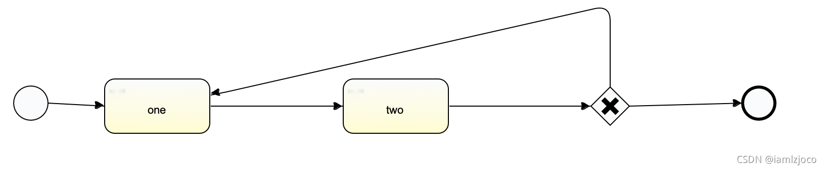 如上图,执行到排他网关市,流程可能退回到one节点,也可能结束,这个是根据two节点提交的判断条件决定。