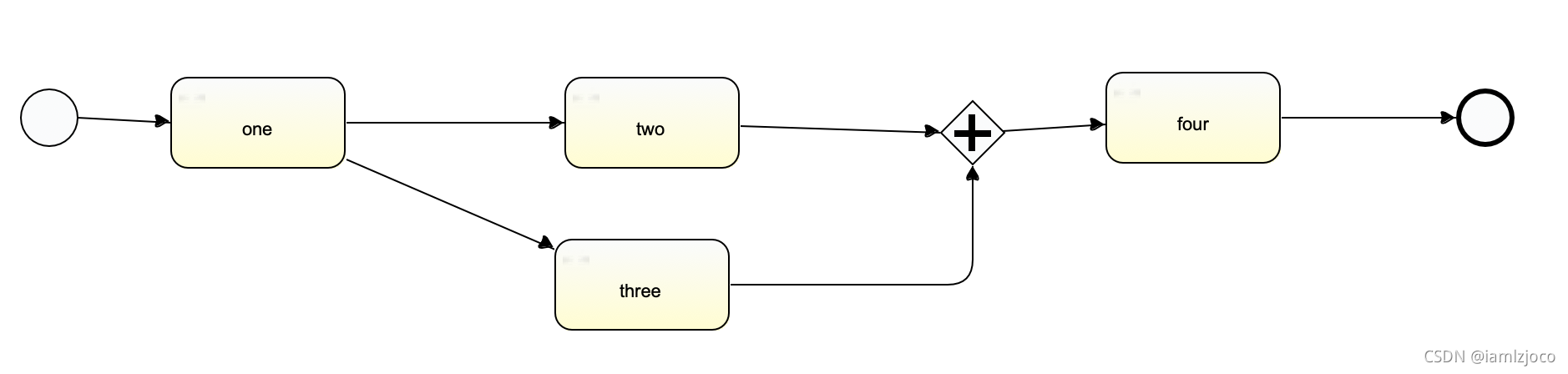 如上图,two节点和three节点都完成后才能到达并行网关然后生成four节点的任务。