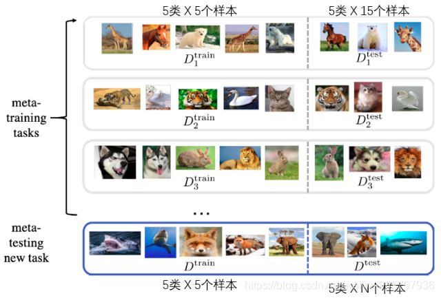 meta training阶段:将数据集分成不同的meta task(即:假设有n个类别,每次取出其中的C个类别进行训练,每个类别K个样本——C-way K-shot problem)