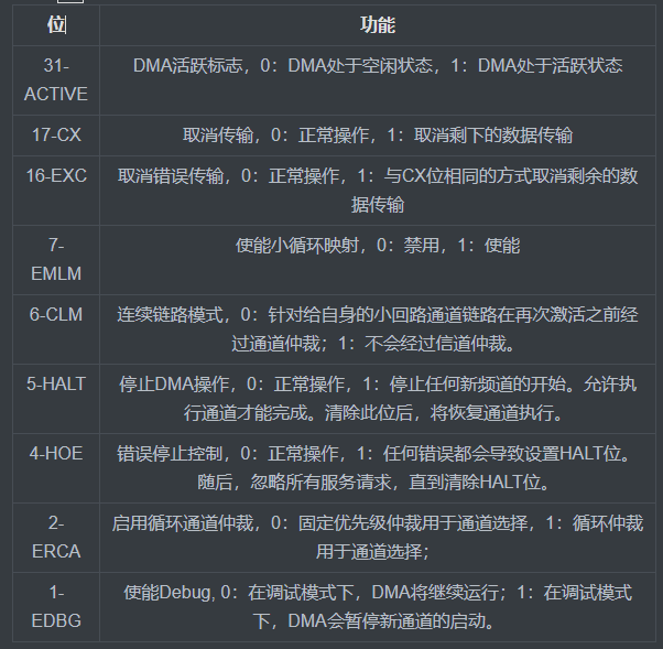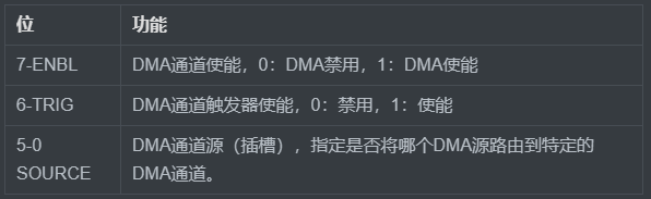 寄存器功能:每个DMA通道都可以独立地启用/禁用,并与系统中的一个DMA插槽(外围插槽或始终打开的插槽)相关联。