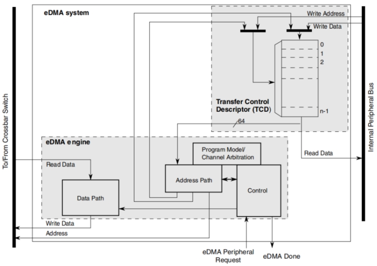 eDMA模块主要分为两大部分:eDMA引擎、传输控制描述符(TCD)内存。