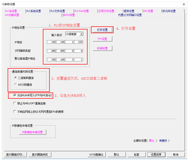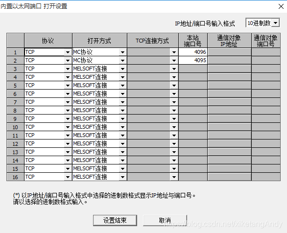 (2)按照上述步骤设置完成之后,点击打开设置,通过选择打开方式,对于Q系列内置以太网,这里选择MC协议,其他型号PLC会有所不同,本地端口号根据实际情况设置,这里开启了两个端口用于连接,实际如果只有一个连接,可以只设置一个即可。
