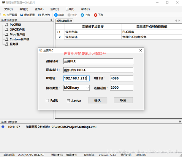 (1)通过PLC设备右击选择三菱PLC,在打开的窗体中设置好IP地址、端口号等相关参数:
