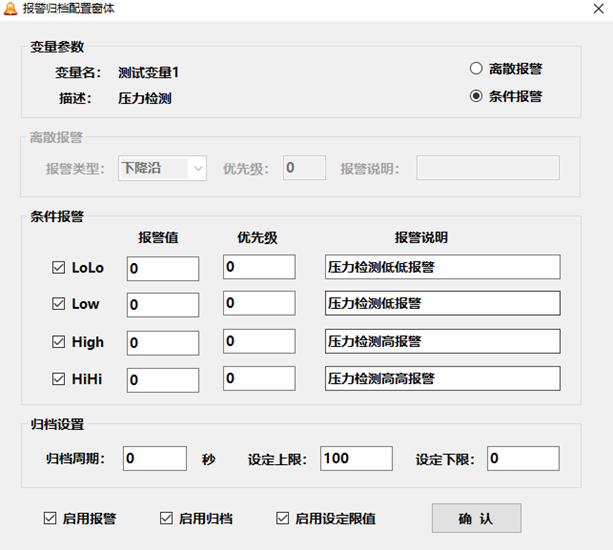 (4)对于变量配置,左下角会有一个报警归档配置,主要用于配置该变量的报警类型、归档方式及设定限制: