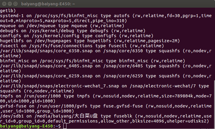 1. 在命令行中输入mount命令查看内存卡驱动名,通过下图中,最后一行,可以看到,我的内存卡驱动为/dev/sdb1,按道理下面写入镜像的驱动路径应该是/dev/sdb1,但我试了发现写完后,内存卡里什么都没有。路径使用/dev/sdb可以成功。