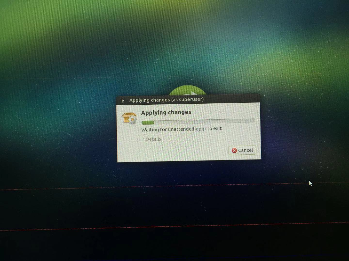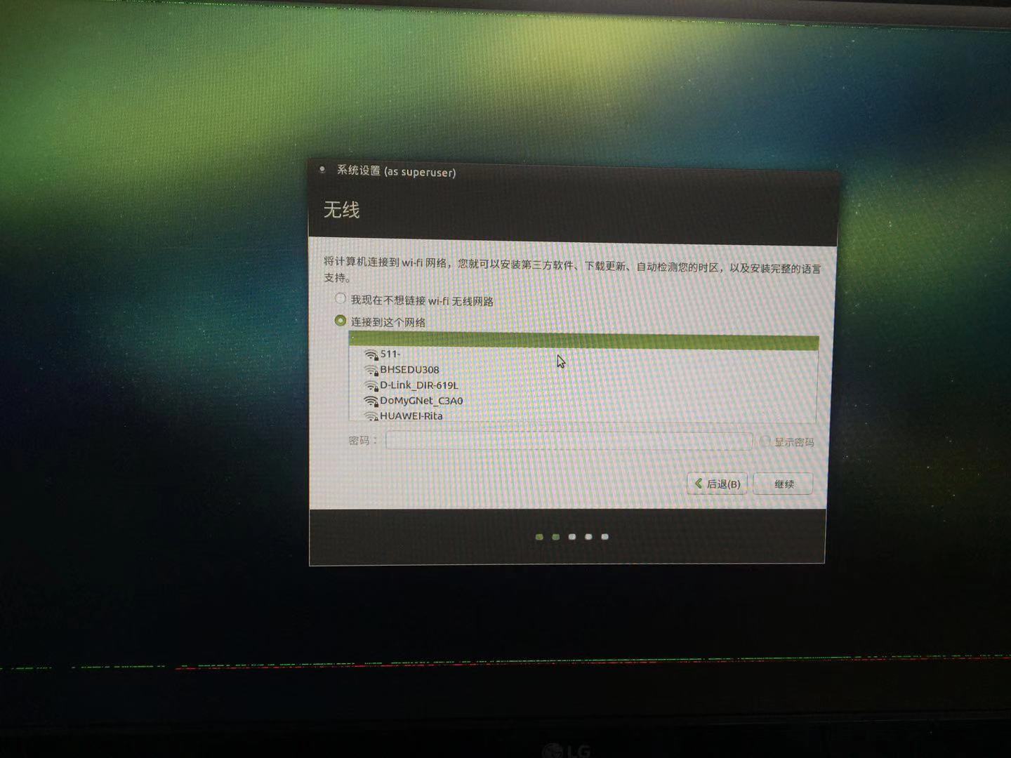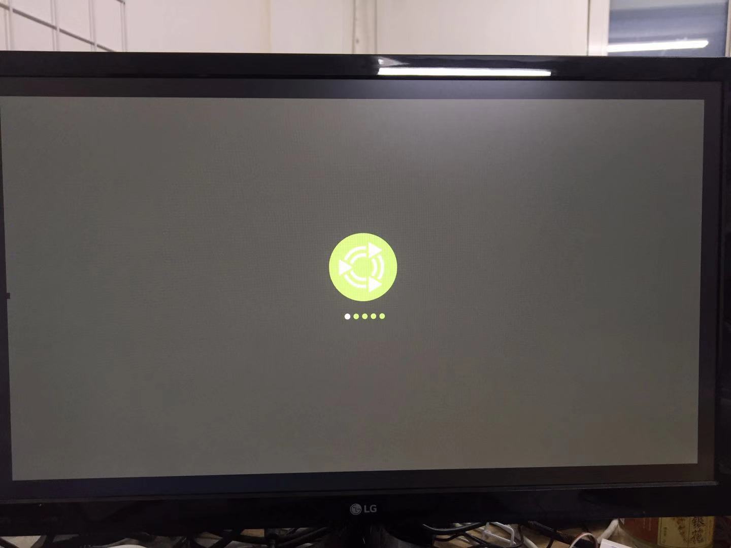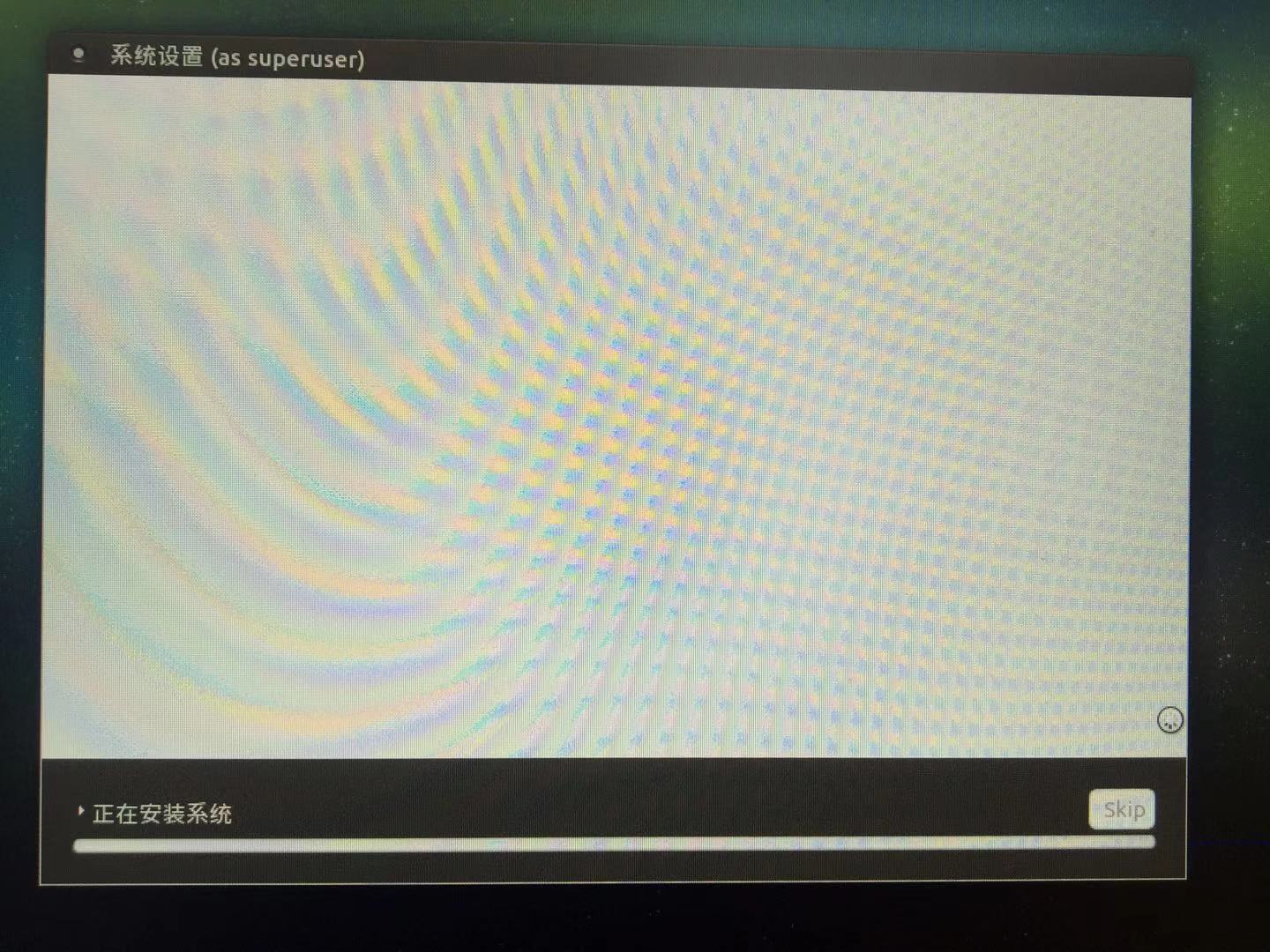 将写入系统镜像的内存卡插到树莓派上,连接鼠标、键盘、显示器,上电。先有一段初始化,然后是如下画面。第一次安装时,一直卡在这个界面上,插上网线连接路由器后,安装继续进行了。但第二次安装时,没有插网线,这个界面也过去了。