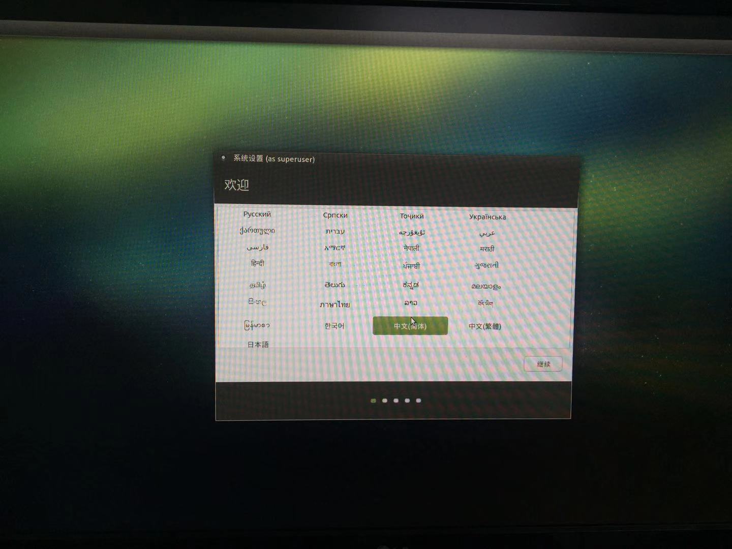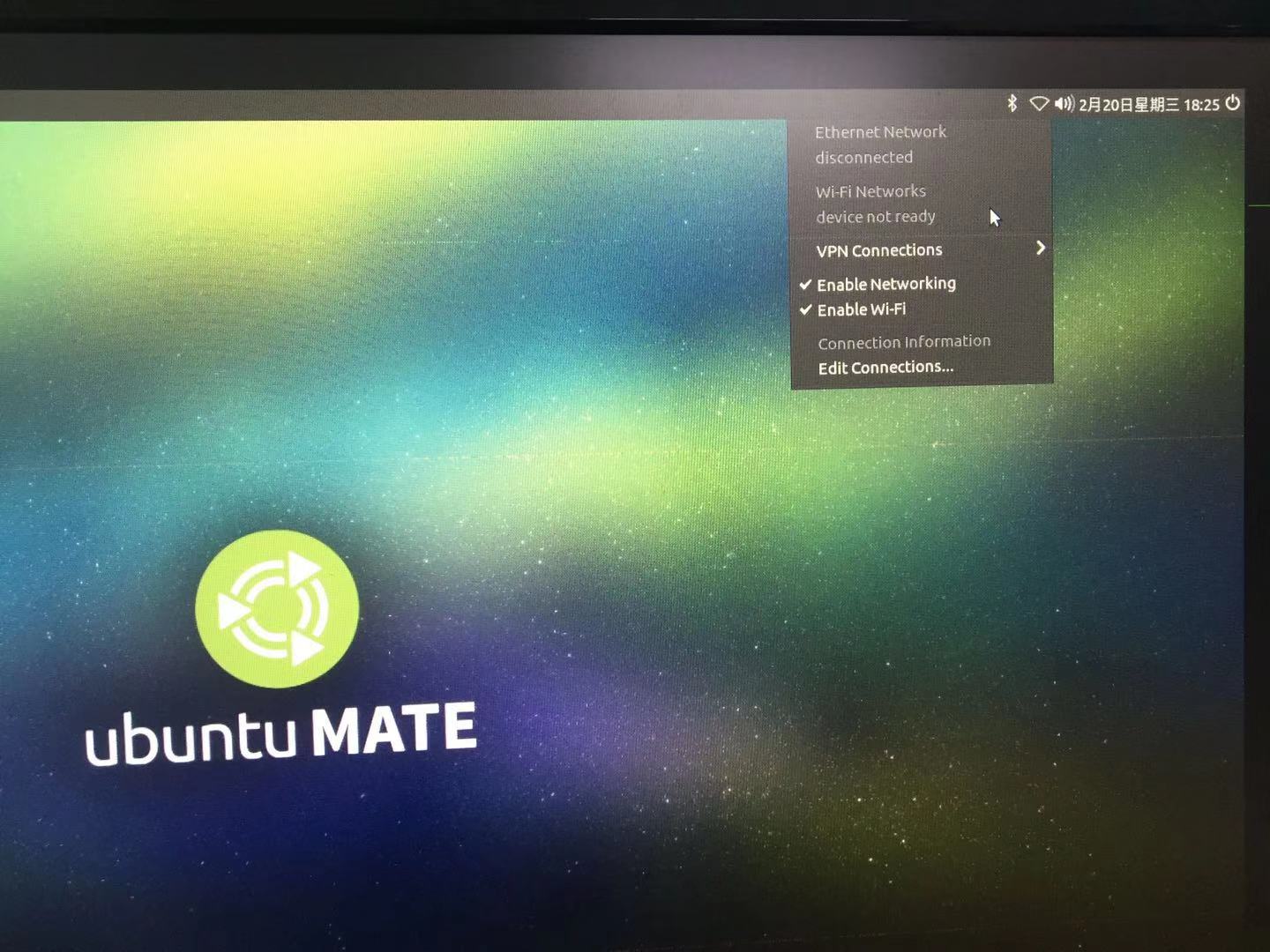 再等待一段时间后,终于进入了系统界面, 点击右上角的无线图标后,发现无线连接相关的按钮是灰的,不要担心,点击右上角的电源按钮,选择重启。