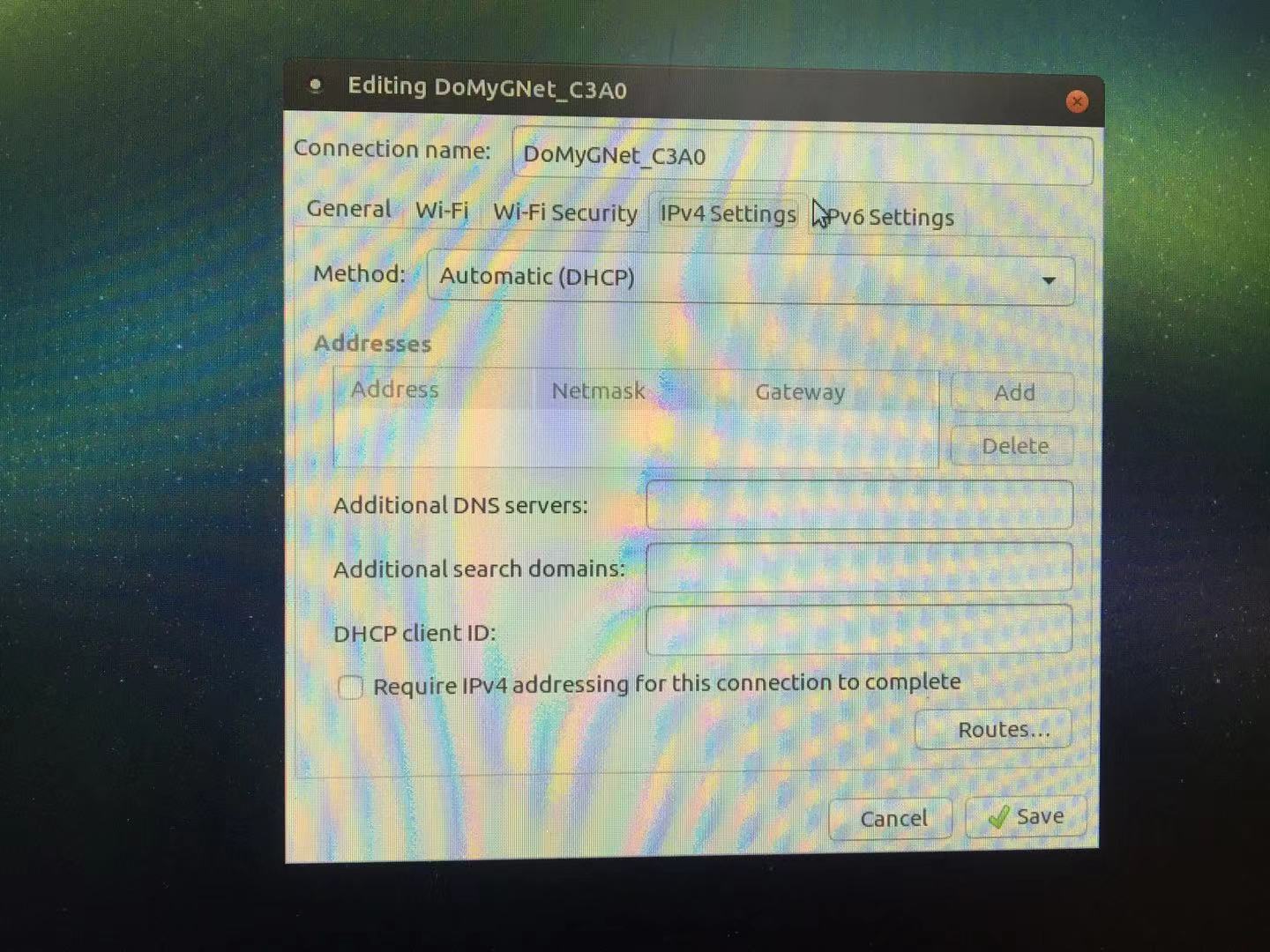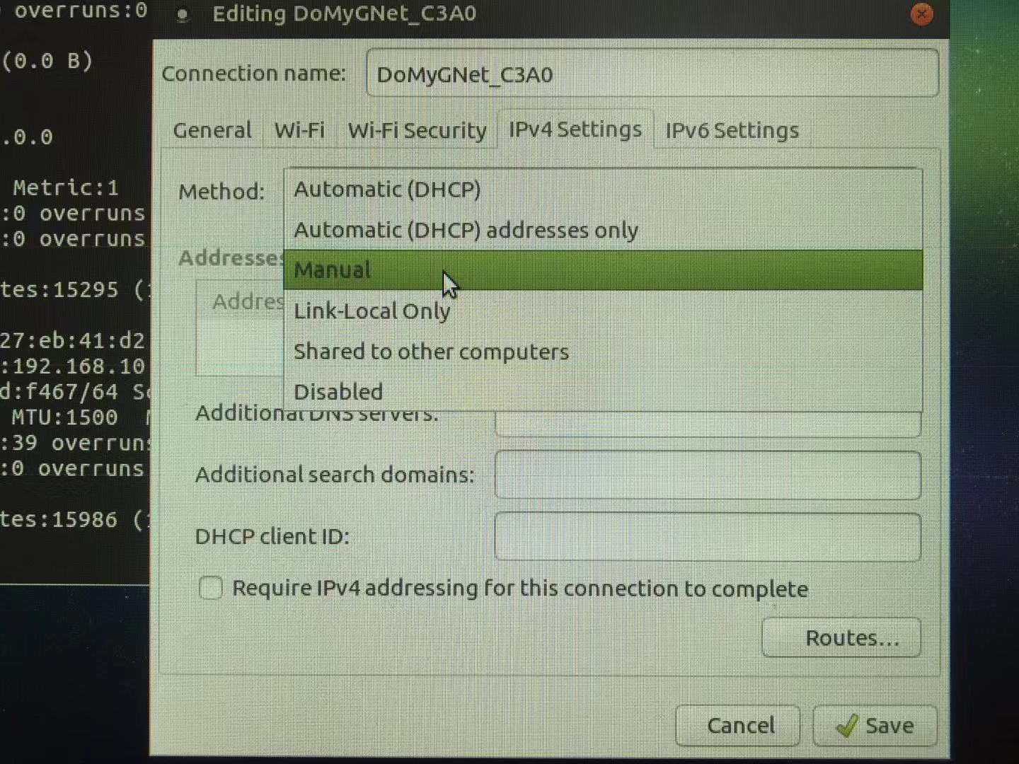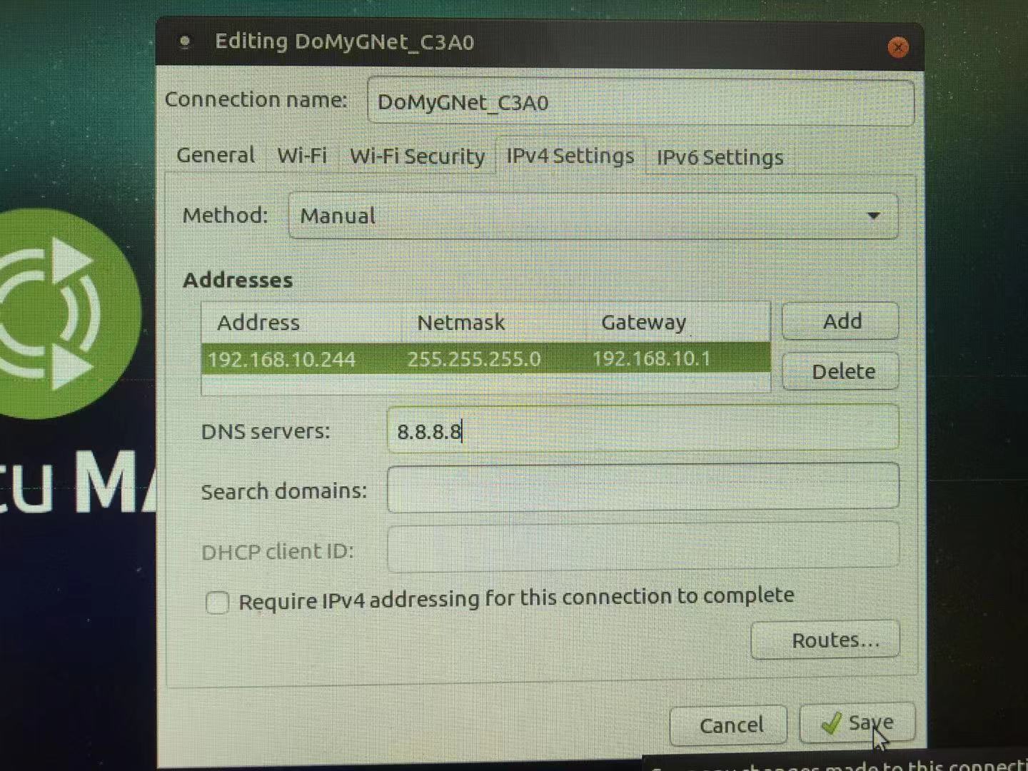 设置静态IP, 点击无线连接里的编辑连接,选中连接的无线,点击编辑(edit)按钮,然后点击IPv4 setting,在Method中选择手动(Manual),然后在addresses中点击添加(Add)按钮,将ip、子网掩码、网关,DNS填上,点击保存。