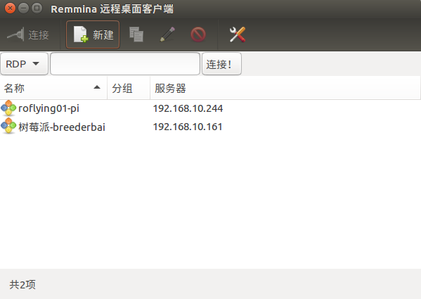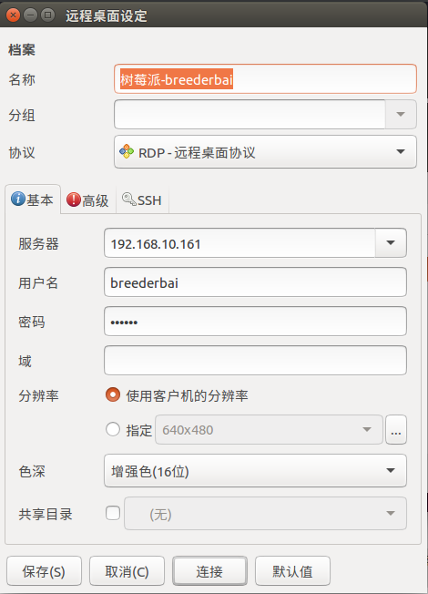 点击新建,输入远程桌面名称、树莓派ip地址、用户名及密码,色深选择16位,选择8位界面是花的。然后点击连接。