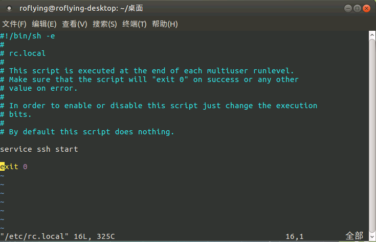 4. 一般安装ssh完成后,会自动启动ssh服务,并自动配置为开机自启动。如果没有,请手动启动启用ssh服务,命令:sudo service ssh start。并设置开机自启动,命令:sudo vim /etc/rc.local,打开文件后在exit 0之前添加service ssh start,保存后退出(如果不会vim,请)。