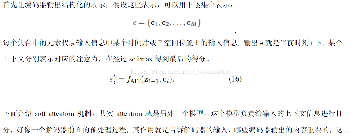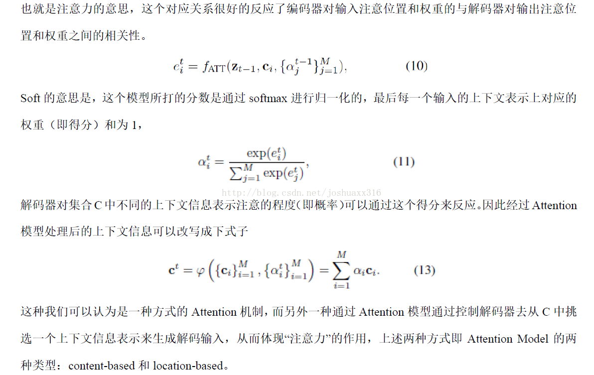 上图的两种attention用法都属于soft attention,即通过确定性的得分计算来得到attended之后的编码隐状态,图示来自论文