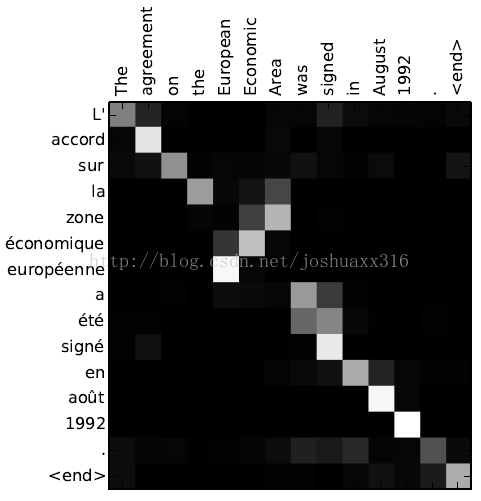 我们甚至可以进一步解释,编解码器内部大致是如何工作的,当然从我看来这有点马后炮的意思,毕竟Attention是根据人的先验设计出来的,因此导致最后训练的结果朝着人指定的目标在走。可以说,就是输入第j维的上下文表示信息与第t时间片输出的关系,第j维可以是空间维度上,也可以是时序上。由于加入Attention会对输入的上下文表示进行一次基于权重的筛选,然而这种显示的筛选模式并不是人工制定这种机制所要看到的结果,而是通过此种加权的方式,让网络能学到空间上或者时序上的结构关系,前提当然是假设这里有一种原先不可解释的相互关系。以上图1可以很清晰地看出机器翻译问题中,加入的attention模型输出权重的分布与输入与输出信息的关系。