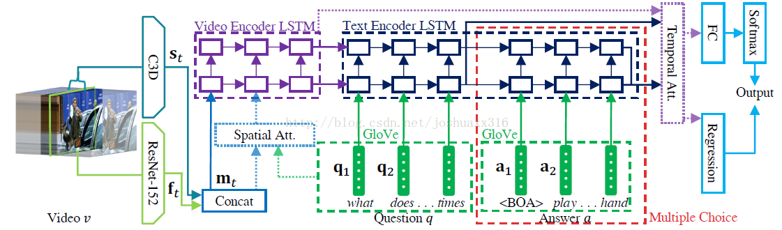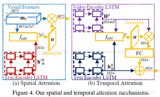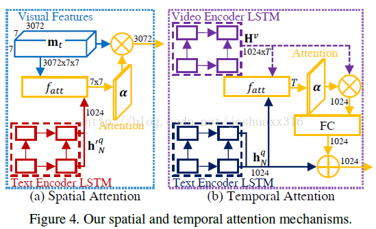 对与视频转文字,图像转文字,VQA问题啊,这种task都需要视觉信息,那么和text信息一样,对visual content进行编码了以后,将编码后的特征表示直接接入解码器,可以得到我们想要的输出,例如text sentences。这就是基础的结构,但是现在加入空间Attention之后,如何改变结构呢。