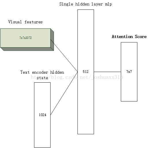 假设前面视觉编码后的特征表示为7x7x3072维featuremaps(论文里的参数)mt,然后来自text encoder的隐状态为hq 1x1024,生成一个7x7的attend mask,at=f(hq,mt),attended featuremaps 为atmt,所以现在的维度不就变成了1x3072了吗?