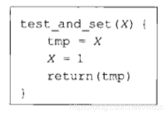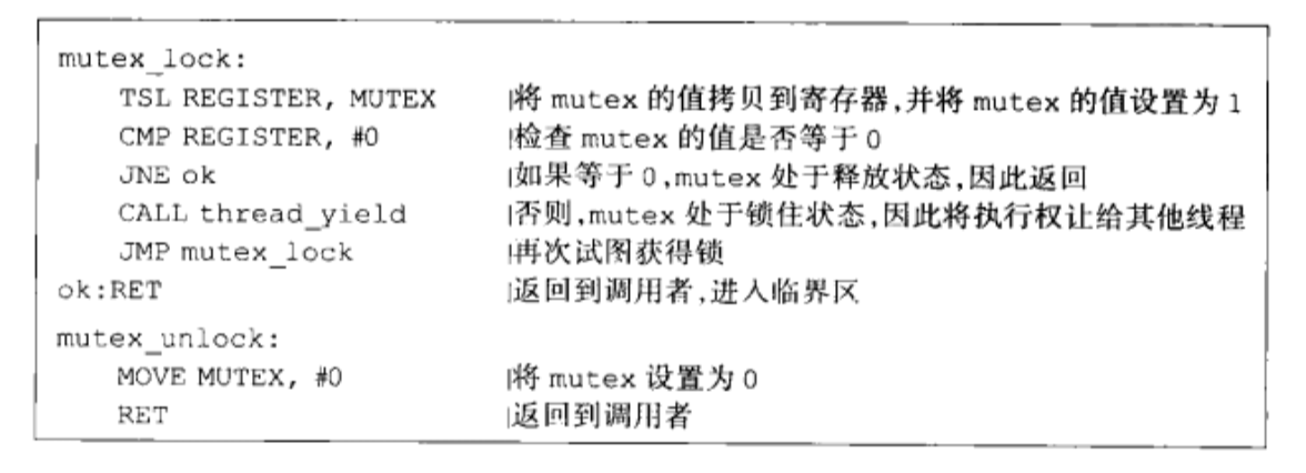 上面的方式过于危险(因为有时会造成系统崩溃,毕竟涉及中断禁止),因此我们就会考虑一下测试与设置的非繁忙等待,但是使用测试与设置来实现锁并不能完全避免繁忙等待,因此我们的目的就是尽量降低等待的时间。利用测试与等待来实现锁的中心思想是:只用繁忙等待来执行闭锁的操作,如果不能获得锁,就放弃CPU。方式如下: