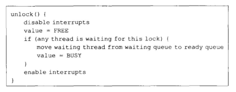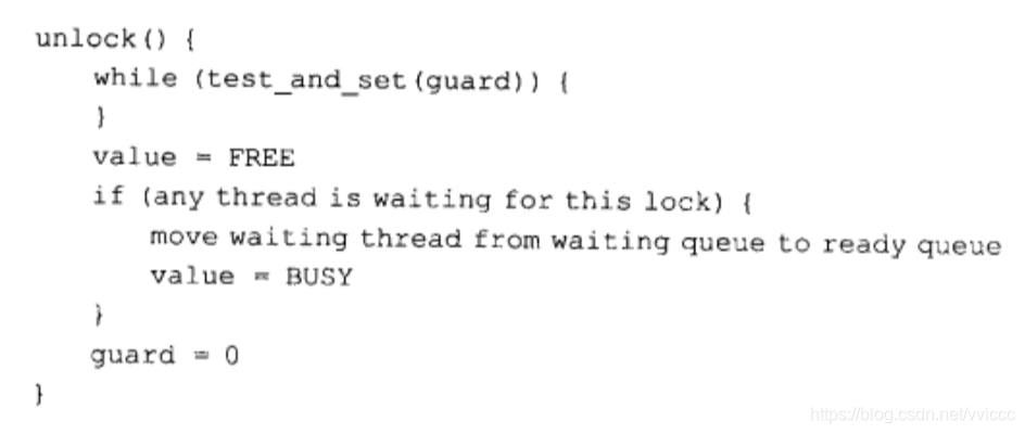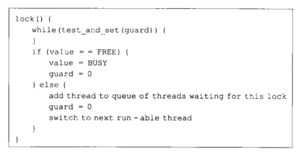 - 如果value的值为BUSY,先将guard设置为0,将自己添加到等待队列上,切换到别的线程(如果另一个线程持有这把锁,线程做完自己的事情后将调用unlock来释放锁,而unlock首先测试guard,如果没有人持有锁,则该线程将value设置为FREE,然后检测是否有线程在锁上等待,如果有,则将等待线程移动到就绪队列,然后将锁交给被叫醒的线程,最后将guard设置为0)。
