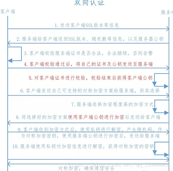 双向认证和单向认证原理基本差不多,只是除了客户端需要认证服务端以外,增加了服务端对客户端的认证,具体过程如下:
