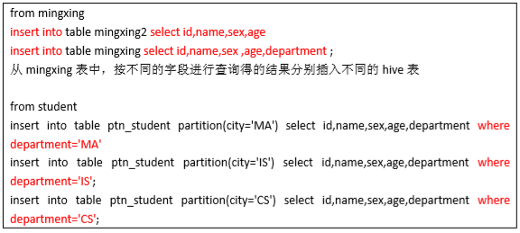 3、多重插入 FROM from_statement INSERT OVERWRITE TABLE table_name1 [PARTITION (partcol1=val1, partcol2=val2 ...)]