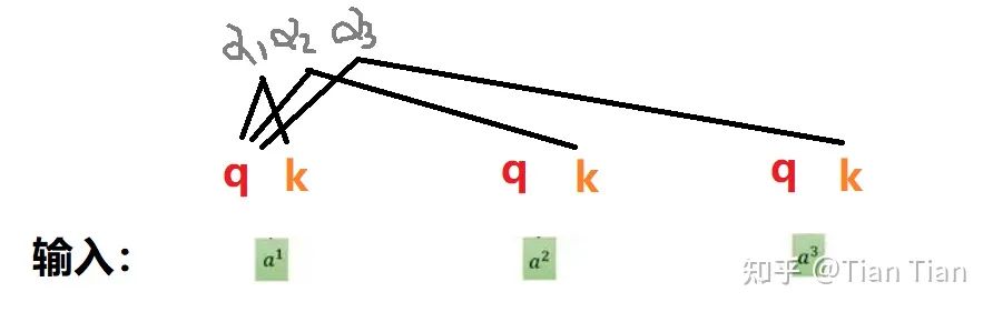 一个不够就定义两个,于是有了q和k。q你可以理解为代表自己用的,用q去和别的输入找关系;k理解为给别人用的,专门对付来跟你找关系的输入。这样子,用自己的q去和别人的k(当然和自己的k也行)做乘法,就可以得到找出的关系:权重 α 了。