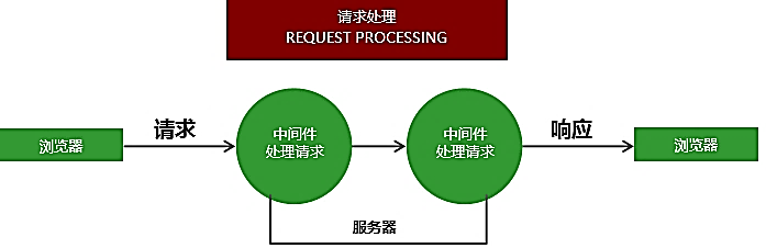 当浏览器发送请求,服务器可以使用中间件 接受这个请求进行处理,直接对客户端做出响应,或者交给下一个中间件继续处理,有下一个 中间件对客户端浏览器做出相应;