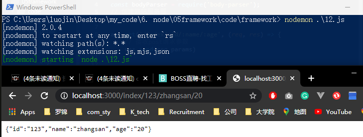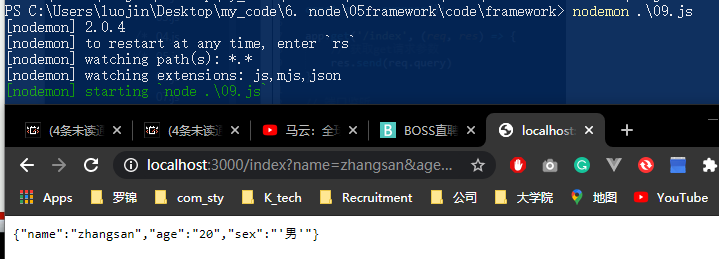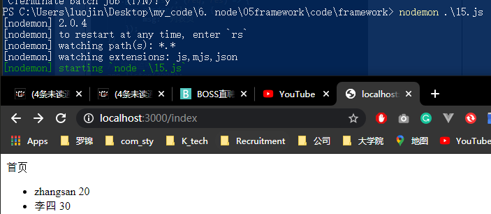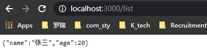 //在定义一个路由,当访问/ list的时候,响应一个其他内容;send内部 还可以传递Json对象 app.get('/list', (req, res) => { res.send({name: '张三', age: 20}) }) //3,程序监听3000端口 app.listen(3000); |