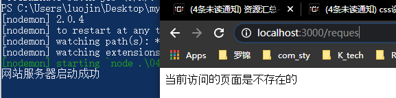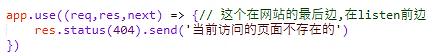 3. 自定义404页面,用户访问路径不存在时,同时用户访问的页面不存在,当所有用户访问的上边所有的路由不存在,才会响应给用户,所以定义在所有路由最后边,不会调用next();status(404)更改状态码,为客户端响应404状态码以及提示信息