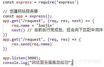 app.get('/request', (req,res,next) => { req.name= "zhangsan"; next(); }); | app.get('/request', (req,res) => { res.send(req.name); });