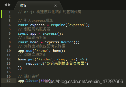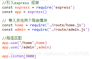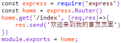 constexpress=require('express')//引入框架,返回express方法,直接调用或者使用他下边的其他方法;比如express.Router用来创建路由 consthome=express.Router();//创建路由对象 app.use('/home',home); //将路由和请求路径进行匹配;当客户端访问什么请求路径时/home',才能使用当前路由来处理,用app.use()方法来匹配 home;代码中并没有请求处理函数,请求来了以后,在哪里处理呢?具体请求处理再二级路由中完成 home.get('/index', () => {//在home路由下的get()方法继续创建路由,访问:/home/index二级路由 res.send('欢迎来到博客展示页面');// /home/index }); |