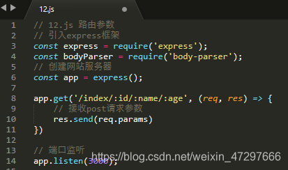 传递和接受 get 请求参数,还有另一种方式; 路由参数;可以让请求地址看起来美观,路由代码容易阅读;更容易看出传了那些参数;:id是一个占位符,请求当前路由,要传递一个id作为参数,不是实际的参数