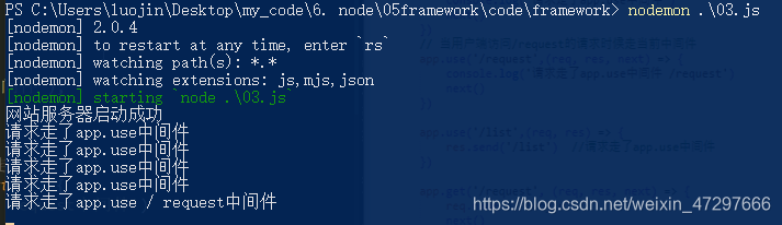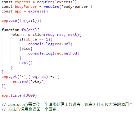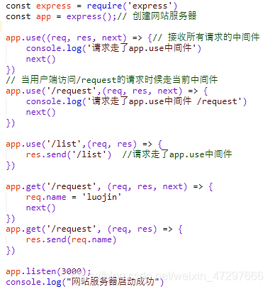 - app.use 匹配所有的请求方式,可以直接传入请求处理函数,代表接收所有的请求,只要客户端发来请求,就可以匹配到当前中间件