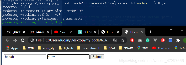constbodyParser=require('body-parser');//引入body-parser模块 app.use(bodyParser.urlencoded({extended: false }));//配置body-parser模块;使用app.use()这个中间件拦截所有请求,调用'body-parser'模块下边的 urlencoded() 方法,对请求进行处理,方法内部会检测当前请求中是不是包含请求参数,如果包含,就接受并转换为对象类型;然后在为req这个请求添加一个属性,属性的名字叫body;并且将参数作为值赋值给 req.body属性,最后调用next()将请求控制权交给下一个中间件 app.post('/add', (req,res) => {//接收请求 console.log(req.body);//接收post请求参数 }) |