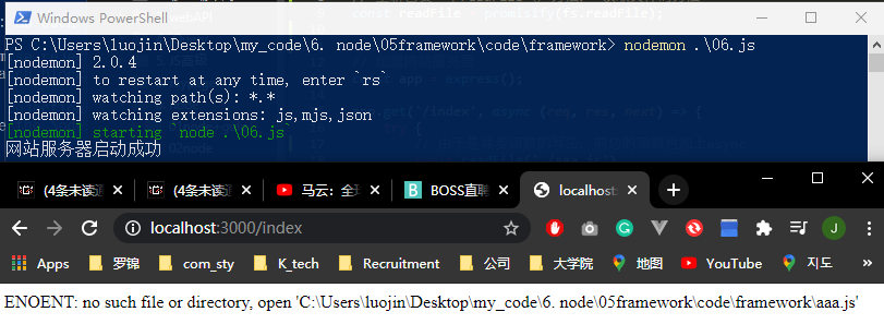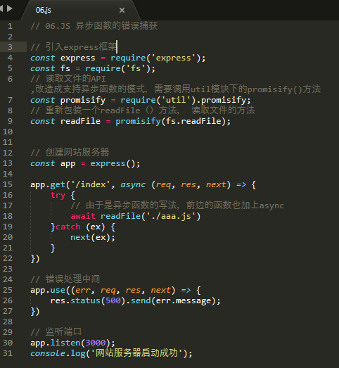 //05,js错误处理中间件 //引入express框架+文件读取模块 const express = require('express'); const fs = require('fs'); //创建网站服务器 const app = express(); //普通的路由中间件 app.get('/index', (req, res, next) => { // throw new Error('程序发生了未知错误')抛出错误,不报错往下执行 fs.readFile('./01.js', 'utf8', (err, result) => { if (err != null) { next(err)// 传参数,代表触发中间件,不传参数,代表控制权交给下一个 }else { res.send(result) } }) // res.send('程序正常执行') }) //错误处理中间 app.use((err, req, res, next) => { res.status(500).send(err.message); }) //监听端口 app.listen(3000); console.log('网站服务器启动成功'); |