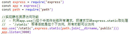 app.use(express.static('public'));express.static(‘参数:静态资源存放的目录’);调用传给app.use()中间件,拦截所有请求,将请求交给express.static()这个方法处理,并且将静态资源目录告诉express.static()方法;方法内部判断客户端发来的请求,如果是静态资源请求,直接响应给客户端,终止请求;如果不是再方法内部调用next()将请求控制权交给下一个中间件;开启静态资源访问功能后,就可以,public目录下面的文件就可以通过以下方式访问了。