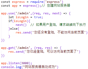 可以调用第三个参数next()方法将请求的控制权交给下一个中间件,直到遇到结束请求的中间件