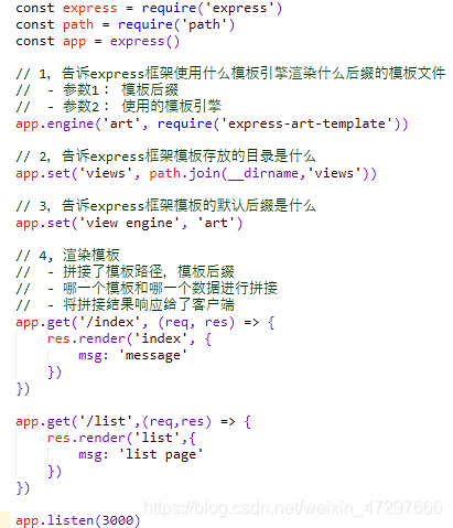 //告诉express 框架,使用的模板引擎是什么? 当渲染后缀为art的模板时 使用express-art-template; app.engine('art',require('express-art-template')); //设置模板存放目录 app.set对express框架进行配置 app.set('views',path.join(__dirname, 'views')); //渲染模板时不写后缀 默认拼接art后缀 app.set('view engine', 'art'); app.get('/', (req,res) => { //渲染模板 res.render('index'); }); |