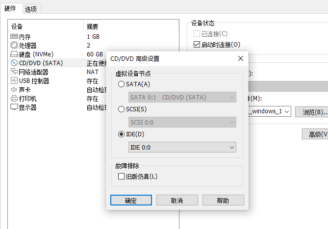 步骤:编辑虚拟机设置,点击CD/DVD,选择高级选项,将虚拟设备节点改为IDE。