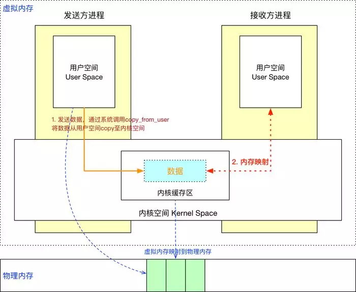 发送方进程通过系统调用 copyfromuser() 将数据 copy 到内核中的内核缓存区,由于内核缓存区和接收进程的用户空间存在内存映射,因此也就相当于把数据发送到了接收进程的用户空间,这样便完成了一次进程间的通信。