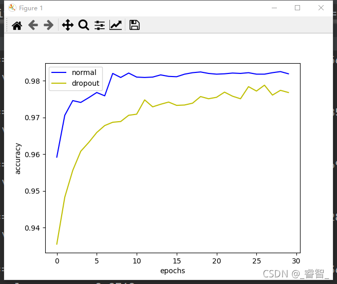 这里训练的次数比较少,如果训练更多的次数,那么dropout的测试集准确率将达到98.8%,比normal的测试集准确率还要高(98,2%)