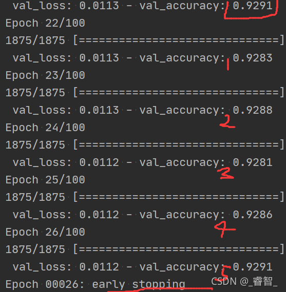 设置val_accuracy为监测对象,记录每次的值,超过5次未超过之前的最佳值,则提前停止训练(早退)。