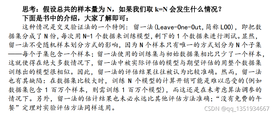 留出法的缺点:当训练集过少时,我们得到的模型并不准确,同时,我们会损失作为测试集的这一部分数据。