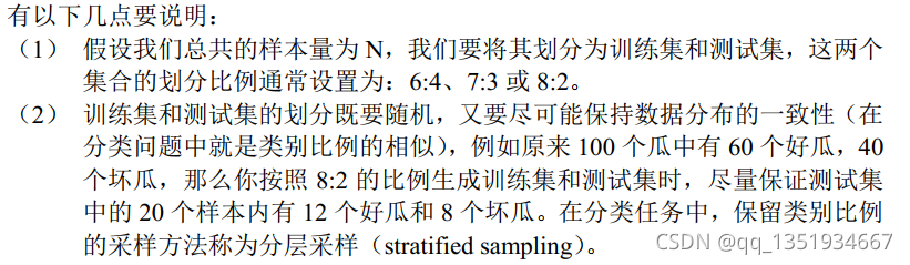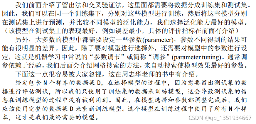 将已知的数据(这里指既知道x 又知道y的数据)分成两部分,一部分通过训练可以得到一个模型,再将另一部分数据的x 放入到这个模型中进行测试,然后预测y,这时候再将预测出来的y与真实的y 进行对比,这时候我们就可以知道这个模型的好坏。这里我们将训练的数据定义为训练集,被测试的数据定义为测试集。这种对泛化能力进行评估的能力称为留出法。