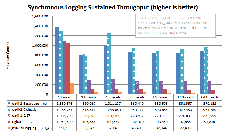 明显可以看出,与各个日志框架对比而言,无论在同步或者异步情况下,log4j2表现更加优异,而其他日志就显得差强人意了。