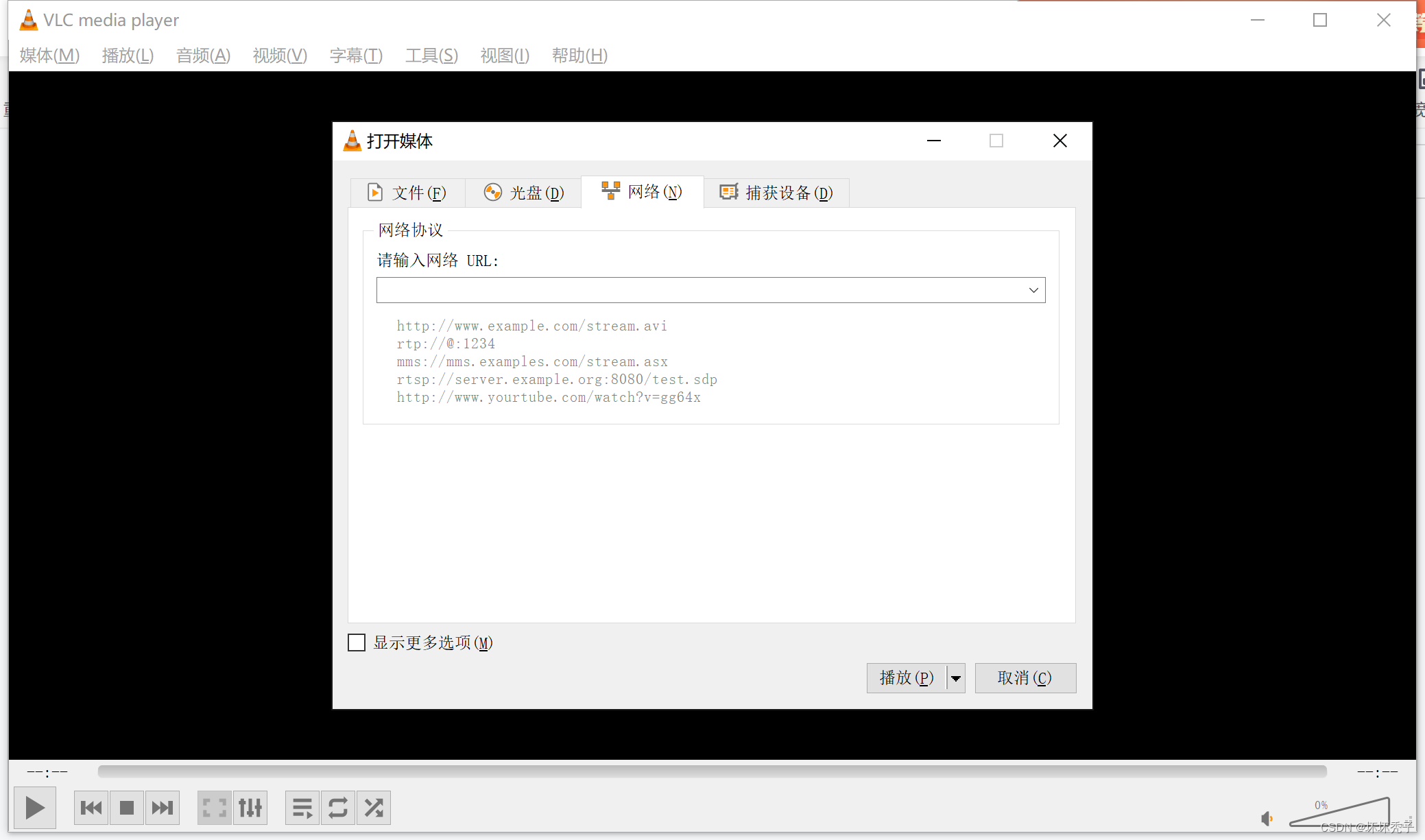 先打开--》 媒体--》打开网络串流--》网络