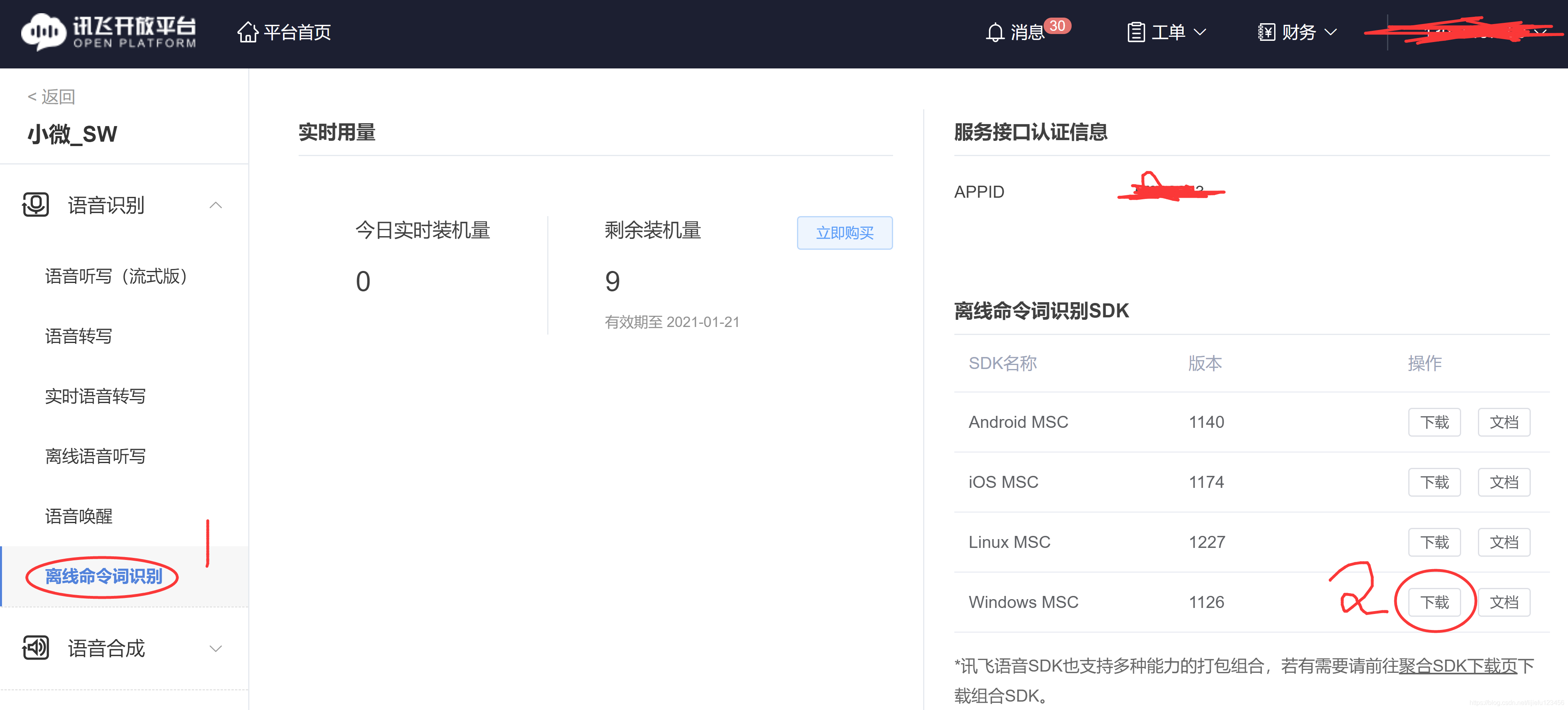 下载离线命令词识别SDK windows MSC ,注意下载的SDK会根据你的appid捆绑在代码段里,应该是讯飞的版权策略