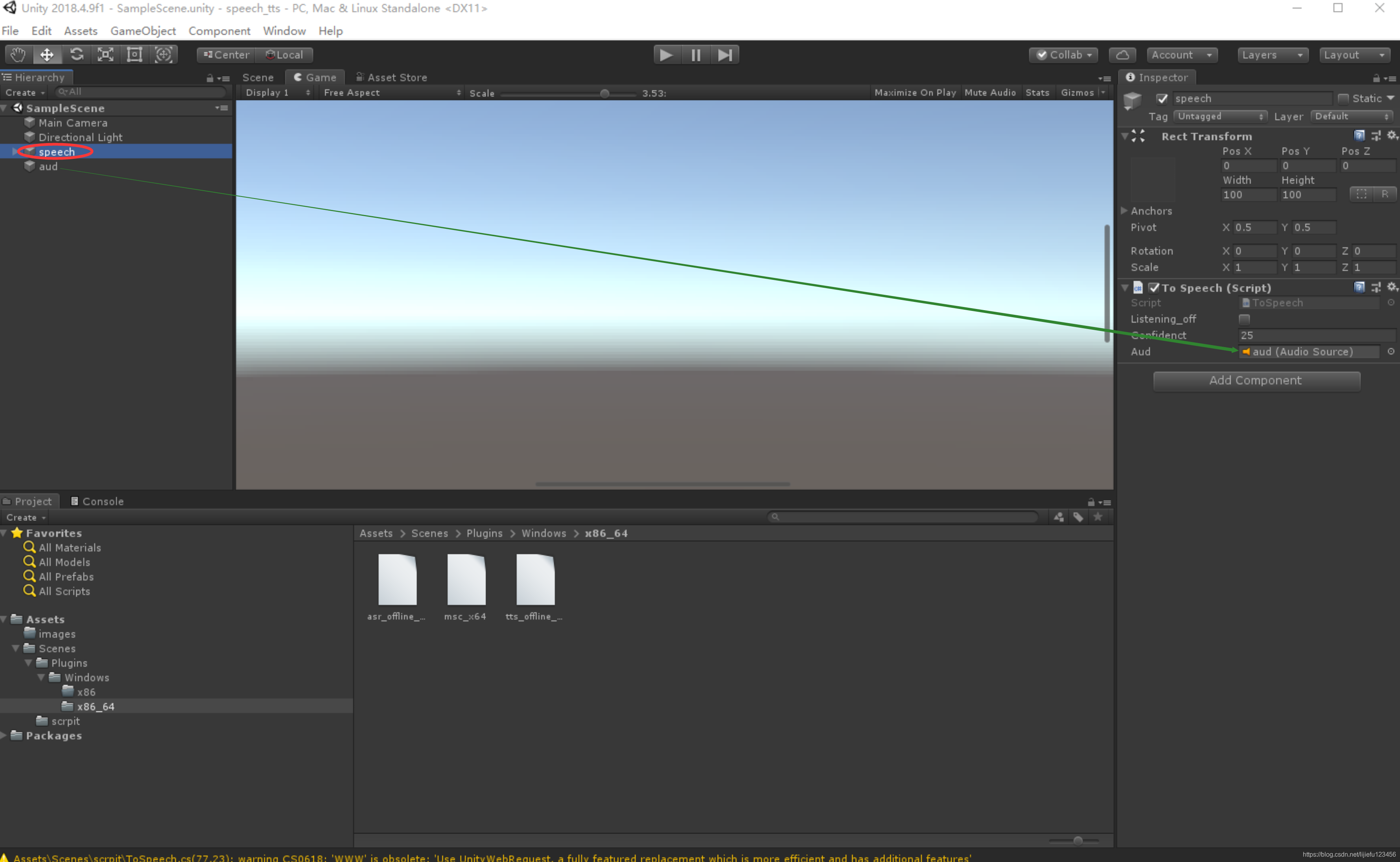 1,两个离线引擎不能同时运行,所以上面实现的是交替运行模式 就是识别模块运行,朗读模块初始化会失败,反之亦然,这样导致灵活性不强,不确定问题在哪里,也可能是引用了一个msc_x64.dll文件,这里不太确定,unity目录引用原因未能做测试,期待解决方案。