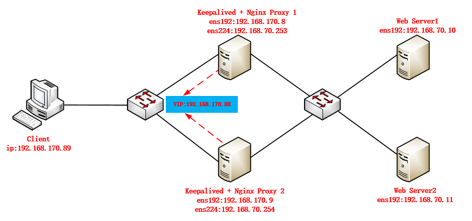 两台Nginx proxy(双主Nginx,各需要两块网卡,ens224连接内网,ens192连接外网)、两台web server(请求的负载均衡)、node1 proxy_server 外网网卡ens192:192.168.170.8/24 内网网卡ens224:192.168.70.253/24
