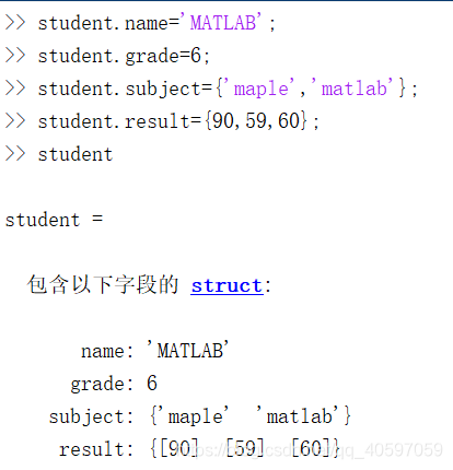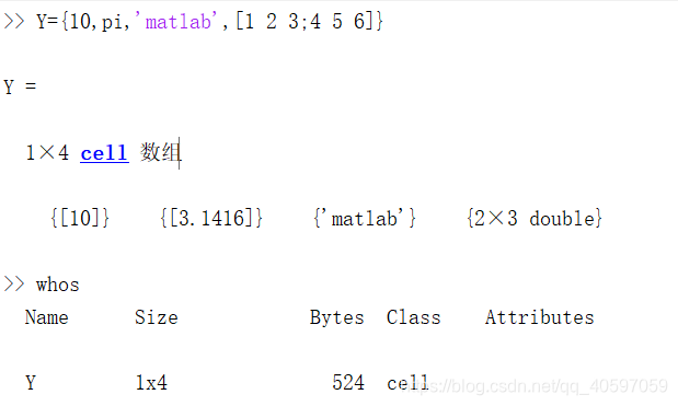 cell数据:以任意形式数组为元素(cell单元)构成多维数组,把不同数据属性的数据放到一个变量中,使用“{}”创建,使用“;”分行