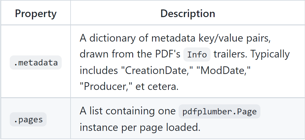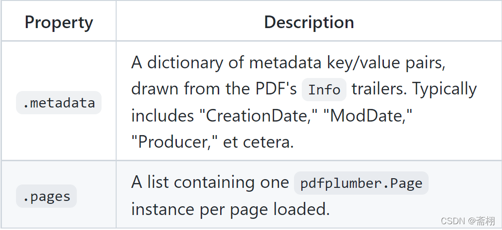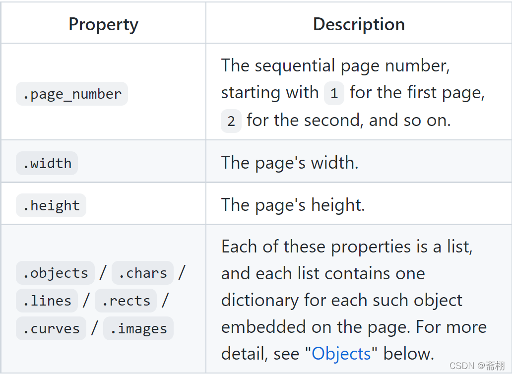 pdfplumber.PDF 和 pdfplumber.Page 的每个实例。页面提供对多种类型的PDF对象的访问,所有着些操作都来自 pdfminer.six 库 对PDF的解析。