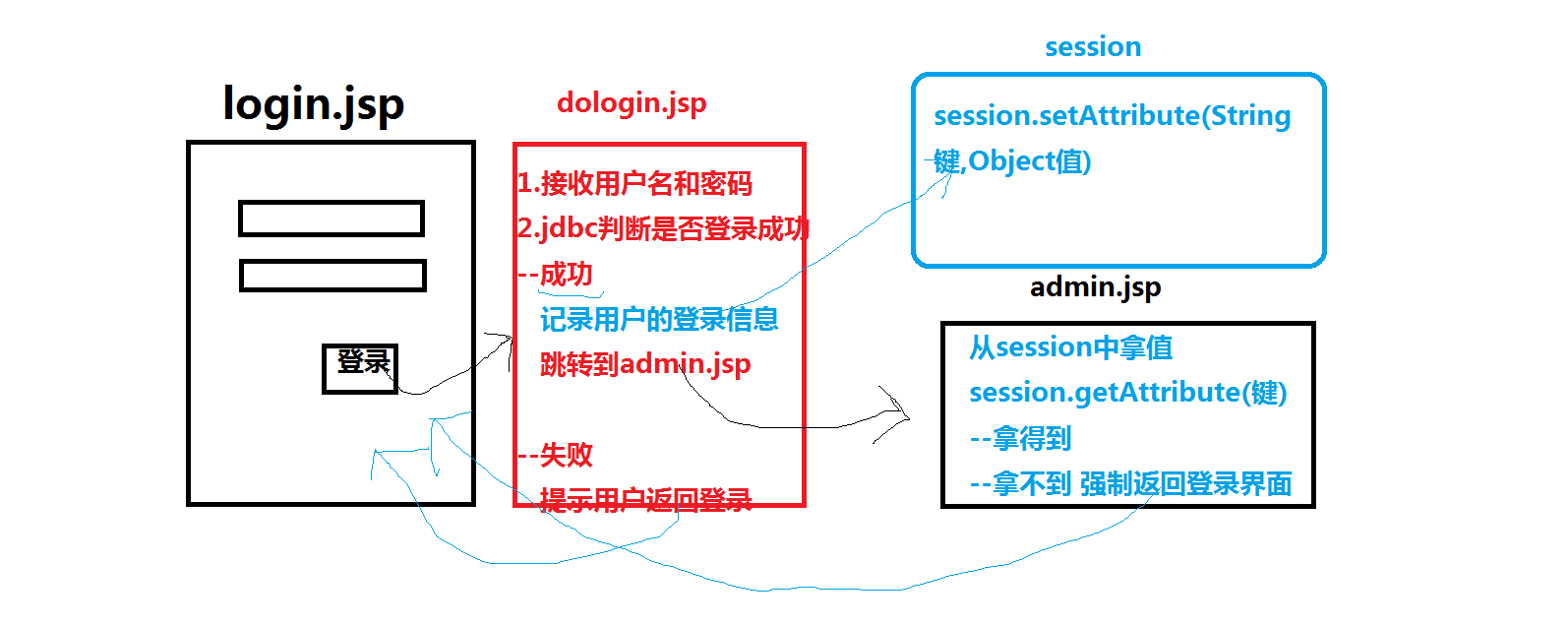 login就是登录界面,dologin负责接收判断,session记录用户登录信息,admin再从session中拿值
