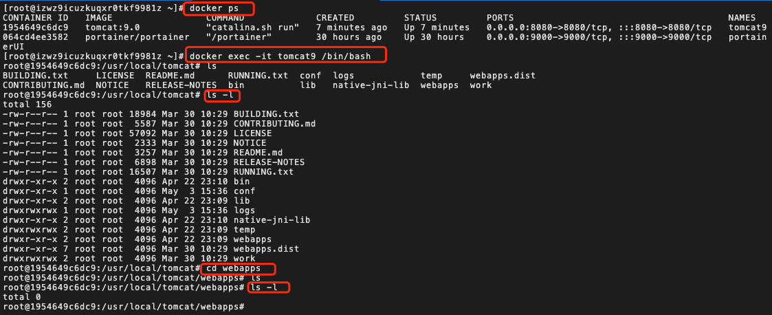 我们进入容器看到webapps下发现啥都没有,能不报404吗?一般我们用tomcat部署项目,都是放在tomcat webapps这个目录下的,如果我们后面采用集群部署项目,那么多个tomcat容器,难道我都要每次都进入容器把应用拷进来;docker其实也想到了,docker可以提供卷挂载,我们只需要将容器中指定目录挂载到我们主机上,就可以实现部署一份,多份同步了;